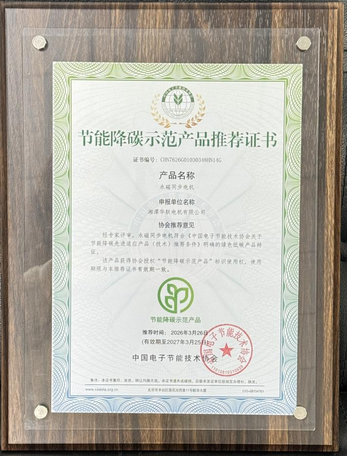 Недавно синхронный двигатель с постоянными магнитами компании Xiangtan Hualian Motor Co., Ltd. прошел авторитетную проверку Китайской ассоциации технологий энергосбережения в электронике. Благодаря передовой энергосберегающей технологии и выдающимся показателям сокращения выбросов углерода, он был успешно выбран в качестве «Демонстрационного продукта по энергосбережению и сокращению выбросов углерода» и получил официальный сертификат рекомендации, войдя в число эталонов экологического развития отрасли.